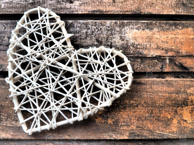 Сердце, сотканное из деревенских легких стержней или нитей. Плетеная форма ручной работы. День святого Валентина. Открытка. Деревянный фон текстуры. Концепция любви