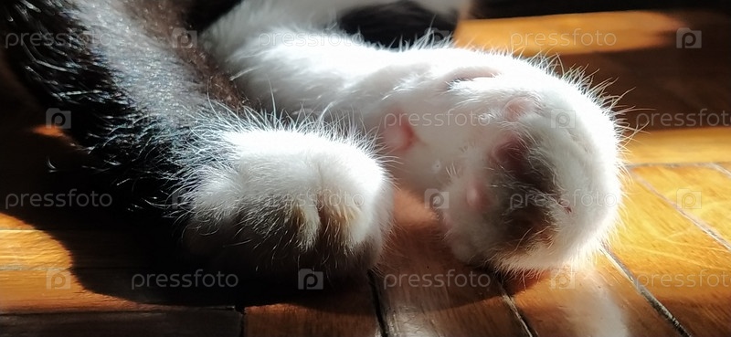 Лапы кошки лежат на полу. Черно-белый питомец протянул лапы и отдыхает. Кот греется на солнышке. Расслабленная поза. Мягкие подушечки на кошачьих лапках. Старый пол