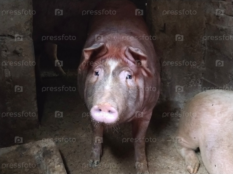 Свинья с коричневой кожей в свинарнике. Сельское хозяйство. Производство свинины. Лицо свиньи появляется из темноты. Животное смотрит на фотографа
