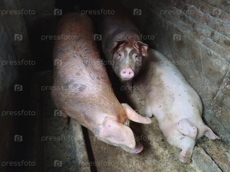 Три поросенка в свинарнике. Сельское хозяйство. Производство свинины. Поросята мясной породы