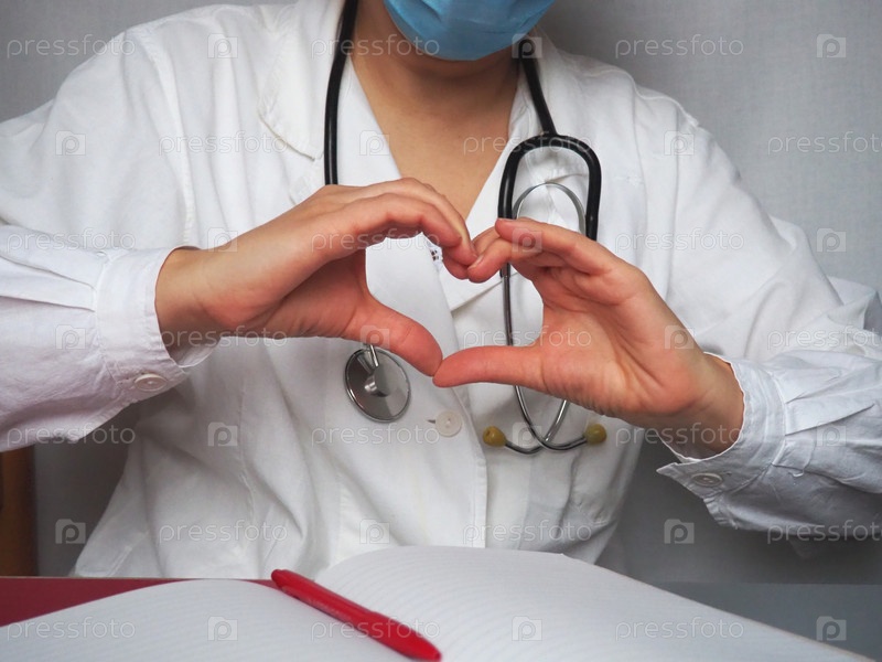 Врач в маске и со стетоскопом показывает руками сердце. Блокнот и ручка на столе. Жест руками. Форма сердца, сделанная ладонями и пальцами. Профилактика сердечных заболеваний