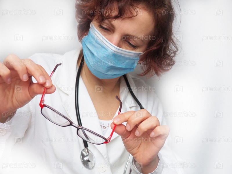 Доктор со стетоскопом осматривает очки в красной оправе. Медицина и здравоохранение. Нахмуренное, сосредоточенное лицо в защитной маске. Прием офтальмолога или кардиолога. Белый фон тумана