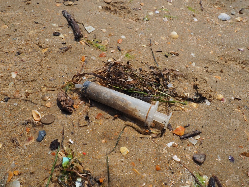 Шприц для инъекций на мокром песке пляжа. Медицинские отходы как экологическая проблема. Внутривенное употребление наркотиков. Мусор на берегу моря. Распространение СПИДа и ВИЧ, гепатита через наркоманию