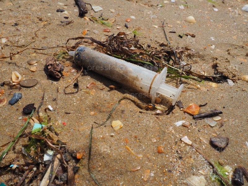 Шприц для инъекций на мокром песке пляжа. Медицинские отходы как экологическая проблема. Внутривенное употребление наркотиков. Мусор на берегу моря. Распространение СПИДа и ВИЧ, гепатита через наркоманию