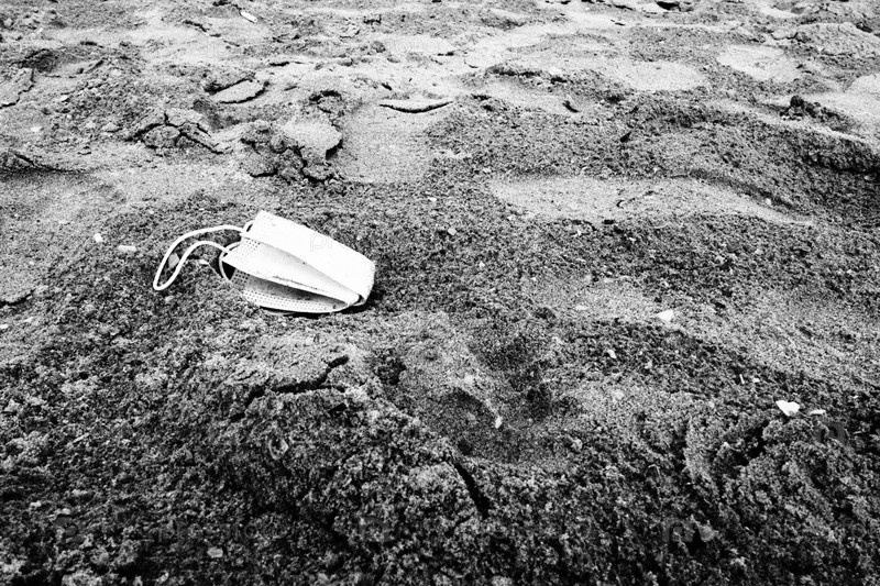 Использованную медицинскую маску оставили на песчаном пляже. Помятый синий щиток на песке. Пандемия коронавируса ковид-19. Экология, переработка и загрязнение окружающей среды одноразовыми изделиями