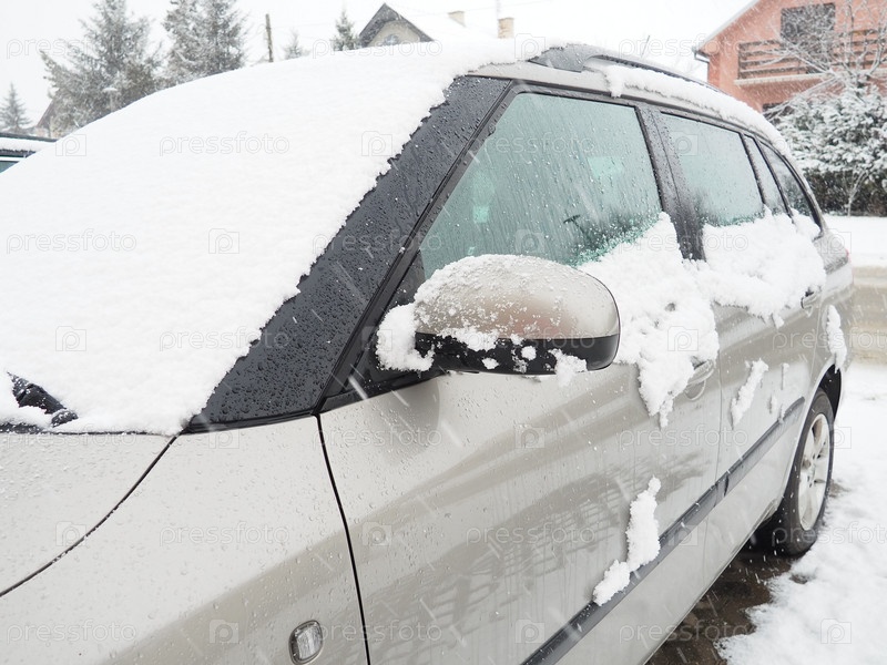 Снег и лед на лобовом стекле, ретровизорах и зеркалах заднего вида автомобиля. Условия зимнего вождения. Уборка снега. Дорожное движение зимой. Металлический автомобиль. Сугробы и слякоть