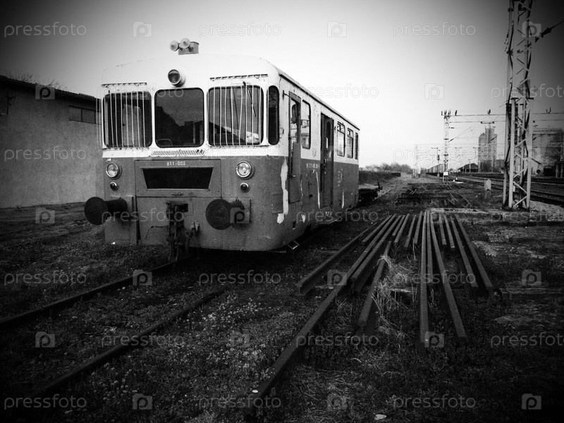 Вагон ретро-поезда. Старинный локомотив Югославии. Сремска-Митровица, Черно-белая монохромная фотография. Металлический корпус железнодорожного транспортного средства. Ржавые рельсы. Железнодорожная станция. Темное виньетирование