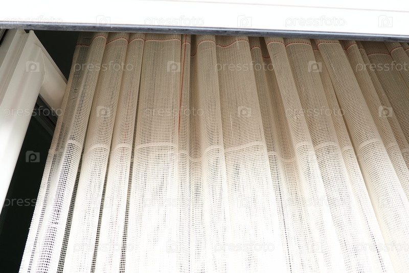 Белые грубые хлопчатобумажные или льняные шторы из переплетений тонких нитей. Простой компактный экономичный интерьер квартиры. Оформление окна в комнате. Красная полоса