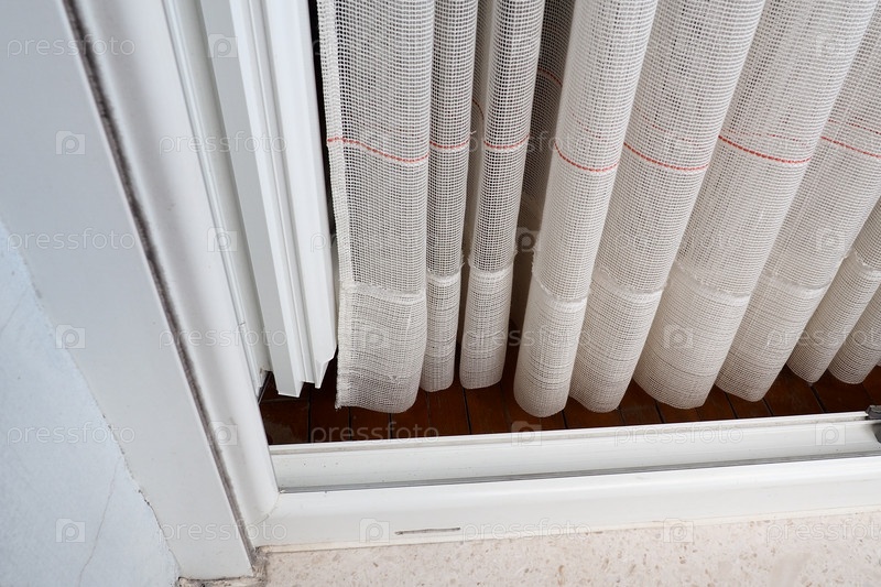 Белые грубые хлопчатобумажные или льняные шторы из переплетений тонких нитей. Простой компактный экономичный интерьер квартиры. Оформление окна в комнате. Красная полоса
