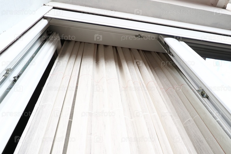 Белые грубые хлопчатобумажные или льняные шторы из переплетений тонких нитей. Простой компактный экономичный интерьер квартиры. Оформление окна в комнате. Красная полоса