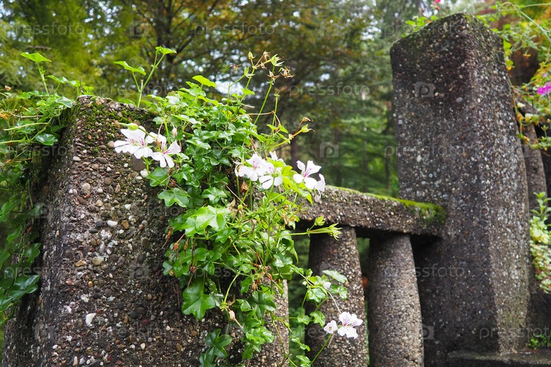 Цветущая белая плющелистная герань-пеларгония в вертикальном дизайне озеленения улиц и парков. Красивая крупная пеларгония-герань-герань. Цветоводство и садоводство. Баня Ковиляча