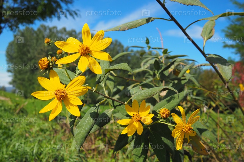 Топинамбур, или клубневый подсолнечник, или груша земляная Helianthus tuberosus вид многолетних травянистых клубневых растений рода Подсолнечник семейства сложноцветных.Желтые цветы