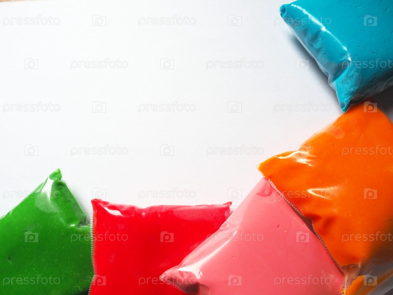 Красочный детский пластилин на белом фоне, красочная глина для лепки теста. Фасовка цветного мягкого пластилина в полиэтиленовые пакеты. Копировать пространство