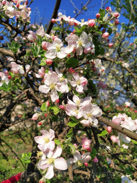 Нежные лепестки цветка яблони. Яблони в пышных цветущих белых цветах. Заметны пестики и тычинки. Весна в саду. Начало сельскохозяйственных работ