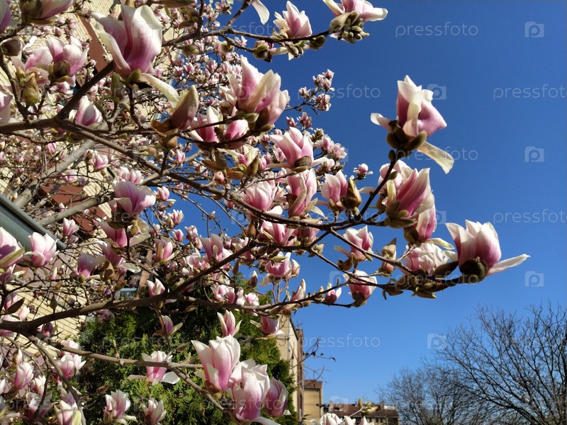 Красивые цветущие розовые цветы и бутоны магнолии на ветвях без листьев. Голубое небо и солнечный свет. Приглашение на свадьбу или открытка с 8 марта. Начало весны. Нежные белые лепестки