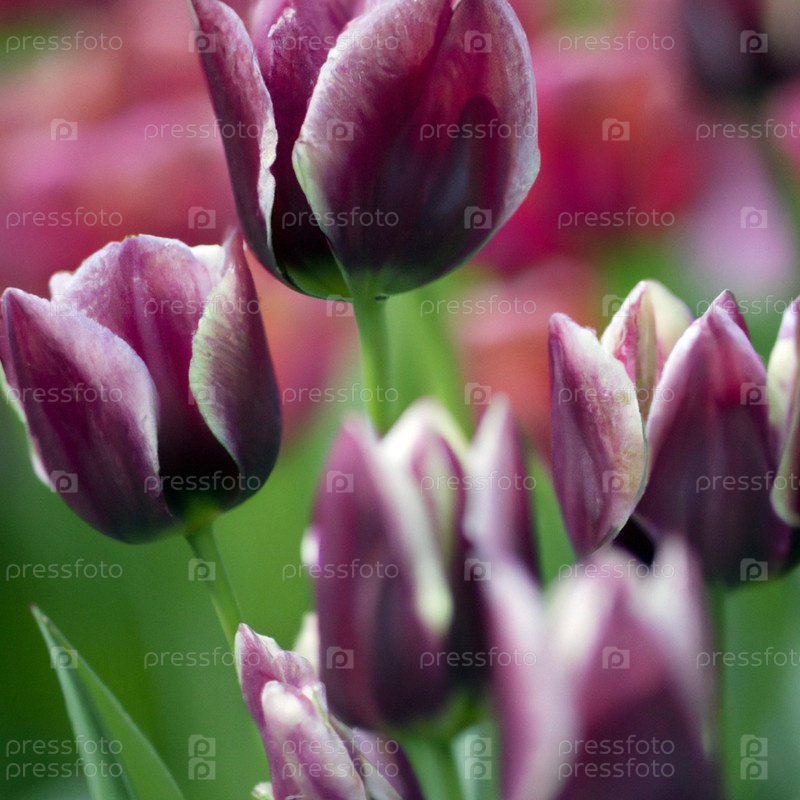Тюльпан Tulipa, луковичные травы семейства лилейных Liliaceae. Выведены тюльпаны, садовые цветы, сорта и разновидности. Цветки нежные розово-фиолетовые. Красивые бутоны. Ландшафтный дизайн, клумба