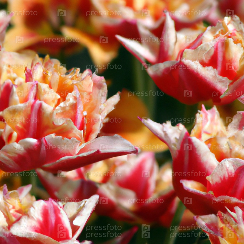 Тюльпан Tulipa, луковичные травы семейства лилейных Liliaceae. тюльпаны, садовые цветы, сорта и разновидности. Цветы нежно-розово-желтые. Красивые распущенные бутоны из смолы. Ландшафтный дизайн, клумба