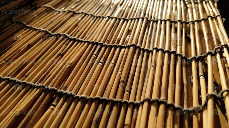 Соломенная подстилка, скатерть или небольшой коврик, разложенный на столе и сфотографированный сбоку. Мягкий вечерний солнечный свет отражается от стеблей. Некоторые палочки сломаны, нитки и веревки сплетены