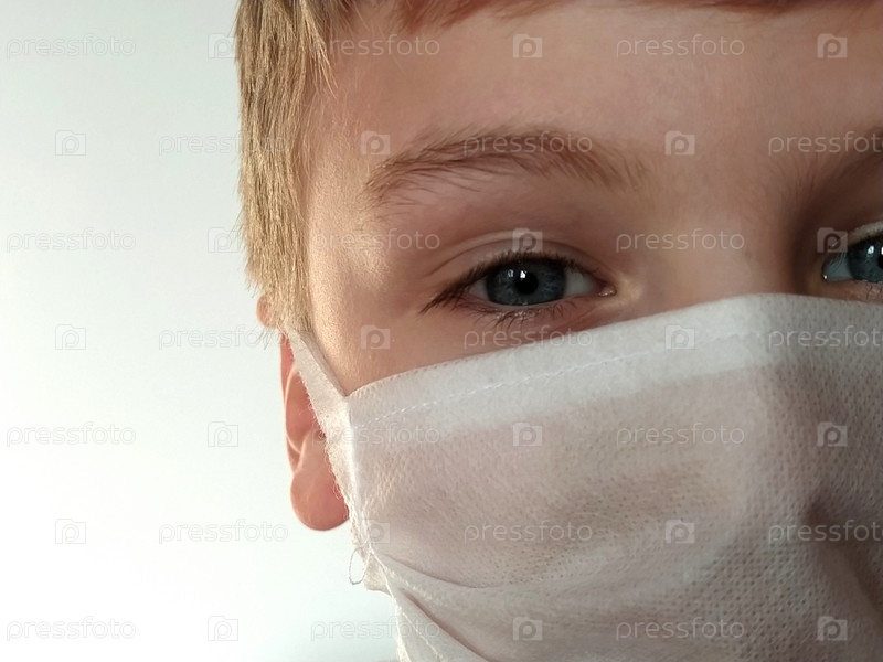 Ребенок в маске. Лицо 7-летнего мальчика в защитной белой хирургической маске крупным планом. Школьник со светлыми волосами и серо-голубыми глазами на белом фоне