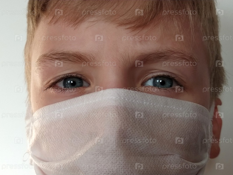 Ребенок в маске. Лицо 7-летнего мальчика в защитной белой хирургической маске крупным планом. Школьник со светлыми волосами и серо-голубыми глазами на белом фоне