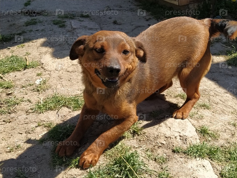 Маленькая рыжая собачка. Солнечная погода, весна или лето. Животное спешит за хозяином и смотрит в камеру