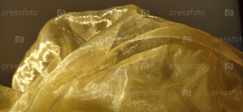 Органза желто-коричневого цвета с бежевым блеском. Блестящая, светоотражающая, красивая ткань для штор, тюлей. Вариант оформления интерьера. Скрученная, небрежно сложенная часть органзы на солнце