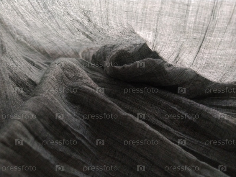 Легкие полупрозрачные портьеры или тюль в скандинавском стиле. Серая плиссированная ткань или мятый текстиль свисают вниз. Крупный план. Нижний край шторы лежит на горизонтальной поверхности. Мягкий фокус