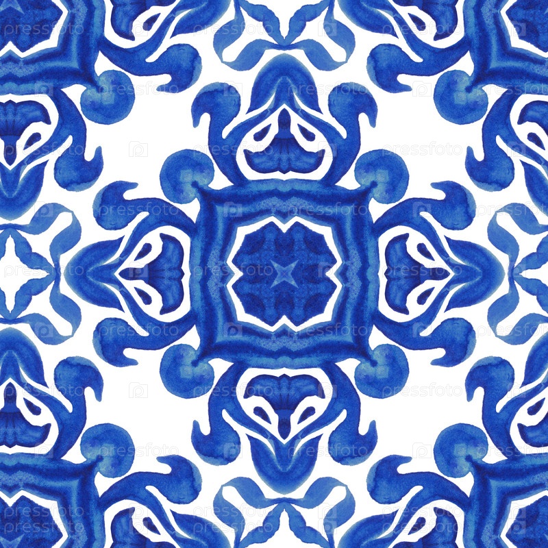 Бесшовная декоративная акварельная текстура. Звездный стиль дизайна плитки мандалы. Синий и белый силуэт снежинки