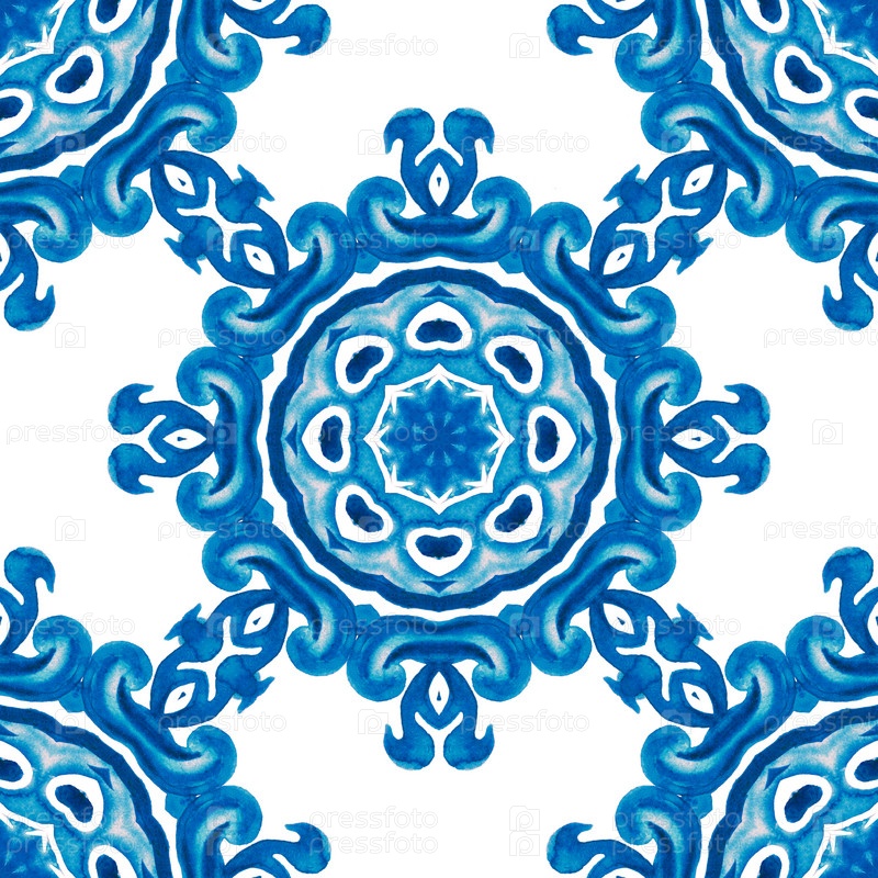 Бесшовная декоративная акварельная текстура. Звездный стиль дизайна плитки мандалы. Синий и белый силуэт снежинки