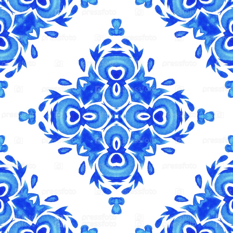 Бесшовная декоративная акварельная текстура. Звездный стиль дизайна плитки мандалы. Синий и белый силуэт снежинки