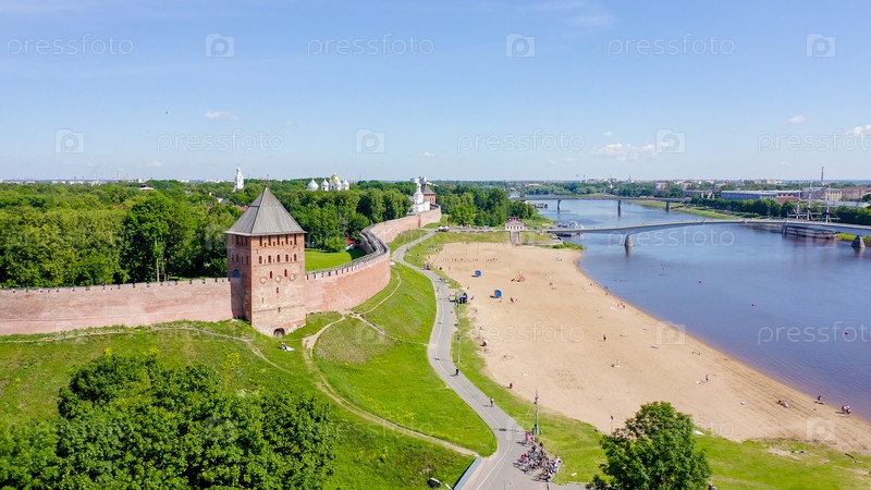 Великий Новгород, Россия. Новгородский Кремль (Детинец), река Волхов. Полет над городом, С дрона