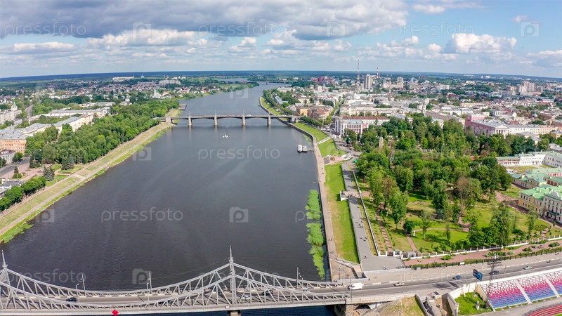 Панорама города Твери, Россия. С высоты птичьего полета. Река Волга, С Дрона