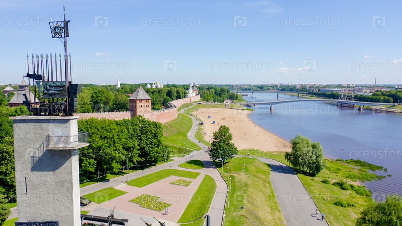 Великий Новгород, Россия. Новгородский Кремль (Детинец), река Волхов. Полет над городом, С дрона