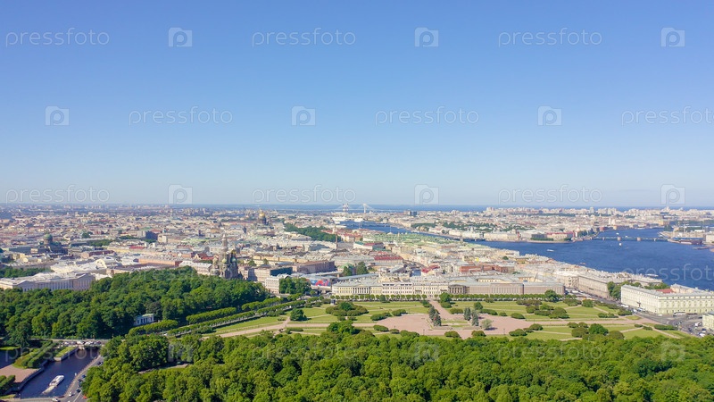 Панорамный вид с воздуха на центр Санкт-Петербурга в ясную солнечную погоду, Россия, с дрона