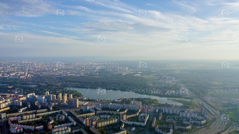 Панорамный вид на Санкт-Петербург с воздуха во время заката. Россия. Спальные места, От дрона