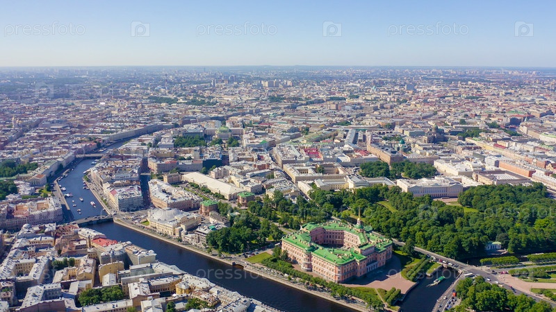 Панорамный вид с воздуха на центр Санкт-Петербурга в ясную солнечную погоду, Россия, с дрона