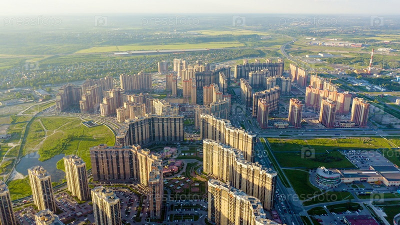 Панорамный вид на Санкт-Петербург с воздуха во время заката. Россия. Спальный район Парнас, От Дрона