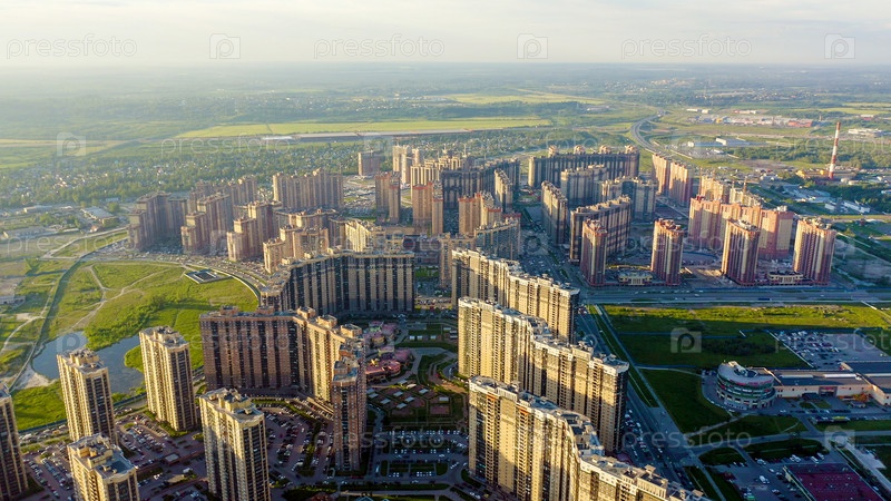 Панорамный вид на Санкт-Петербург с воздуха во время заката. Россия. Спальный район Парнас, От Дрона