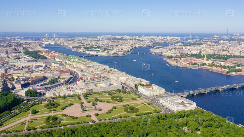 Панорамный вид с воздуха на центр Санкт-Петербурга в ясную солнечную погоду, Россия, с дрона