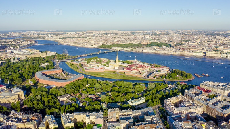 Россия, Санкт-Петербург. Река Нева. Панорамный вид с воздуха на Заячий остров и остров Артелери. Петропавловская крепость. Троицкий мост, От дрона