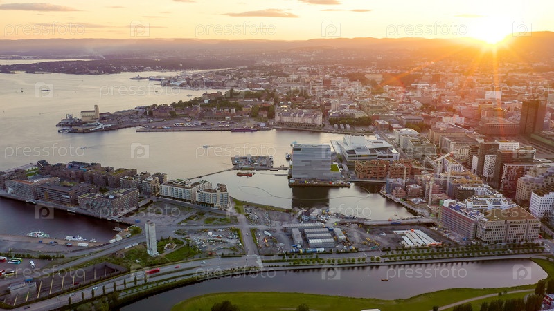 Осло, Норвегия. Вид на город во время захода солнца. Заднего света. Центральная часть города. Оперный театр Осло. Operahuset Oslo, From Drone