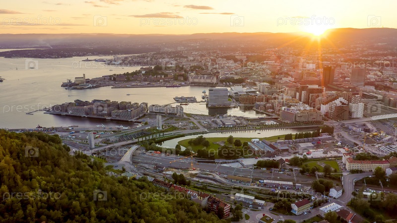 Осло, Норвегия. Вид на город во время захода солнца. Заднего света. Центральная часть города. Оперный театр Осло. Operahuset Oslo, From Drone