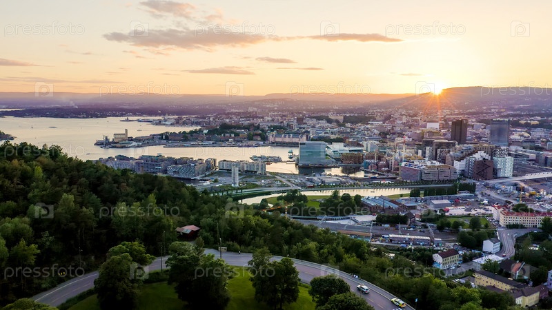Осло, Норвегия. Вид на город во время захода солнца. Заднего света. Центральная часть города, From Drone