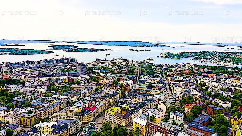 Осло, Норвегия. Вид на город и Осло-фьорд. Яркая иллюстрация в мультяшном стиле. С высоты птичьего полета