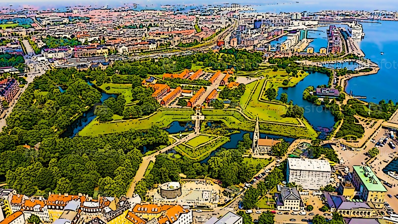 Копенгаген, Дания. Старинный форт Кастеллет. Яркая иллюстрация в мультяшном стиле. С высоты птичьего полета
