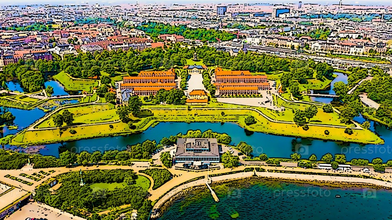 Копенгаген, Дания. Старинный форт Кастеллет. Яркая иллюстрация в мультяшном стиле. С высоты птичьего полета