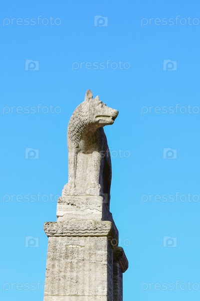 Фото скульптуры волка на фоне голубого неба