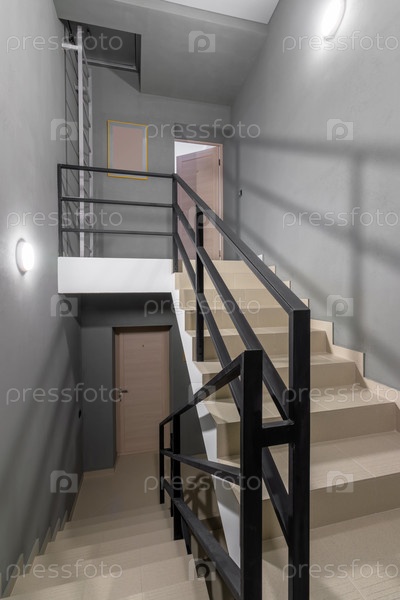 Лестница из плитки в новом доме. металлические черные перила с деревянными поручнямиЛестница из плитки в новом доме. Металлические черные перила, вход в квартиру
