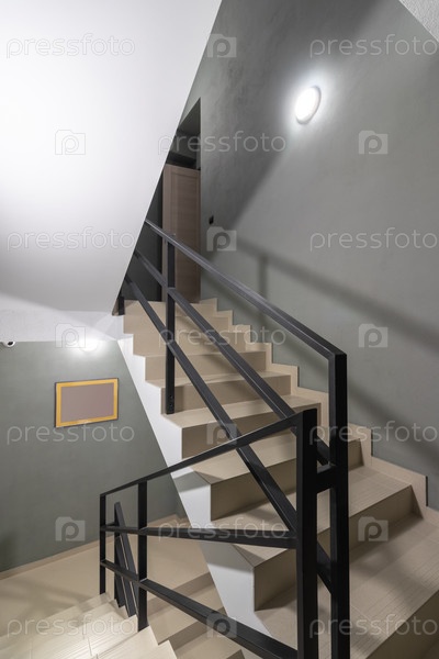 Лестница из плитки в новом доме. металлические черные перила с деревянными поручнямиЛестница из плитки в новом доме. Металлические черные перила, вход в квартиру