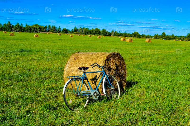 Синий велосипед на скошенном поле